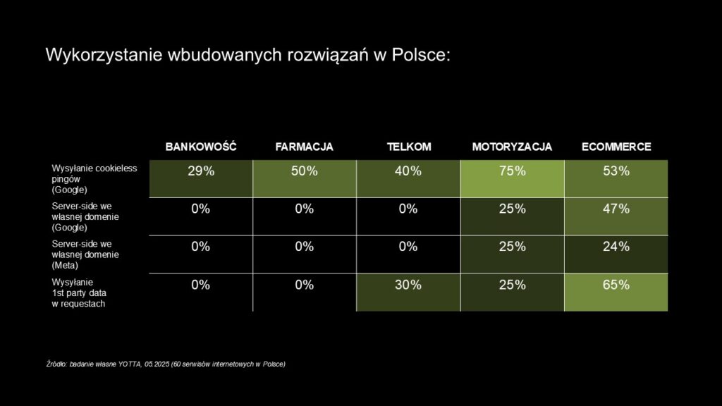 Na podstawie przeprowadzonej analizy można stwierdzić, że ponad połowa badanych stron internetowych korzysta z technologii wysyłania informacji bez ciasteczek, oferowanej przez Google. Możemy z tego wywnioskować, że świadomość na temat rozwiązań pomiarowych, które odpowiadają na nowe wyzwania związane z prywatnością, jest stosunkowo wysoka. Te same analizy pokazują też, że niewielu właścicieli stron korzysta z rozwiązań opartych na technologii identyfikatorów 1st party (16-29%) i server-side (12-18%).
